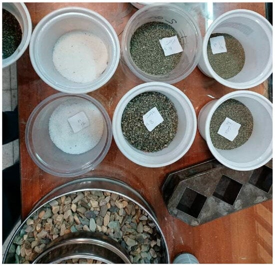 In this research, the methodology consists of several main stages. In the first stage, a laboratory program was designed and executed to complete the necessary database for modeling using deep learning methods. In this stage, compressive strength tests were conducted as the most important part of the experiments. In addition, to design the composite concrete mix using incinerator ash, all the required tests were conducted with different percentages of incinerator ash []. Figure 1 shows an example of pictures related to the required tests. In addition, Table 1 shows an example of the different weight percentages of materials used in the C30 concrete mix design. Figure 2 shows the aggregates which used on concrete mix design.
