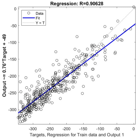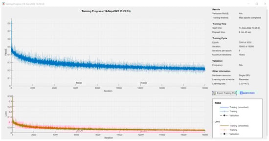 This section describes the implementation of neural network coding, training, and evaluation using MATLAB 9.5 (R2018b). MATLAB is highly preferred by researchers for its comprehensive features, advanced programming capabilities, diverse training algorithms, and robust neural network structures, as well as its powerful processing and statistical analysis capabilities for solving engineering problems. To evaluate the effectiveness of the deep learning method, two key metrics were used: the regression coefficient (R) and the root mean squared error (RMSE), as shown in the following figures []. Figure 3 shows the training curve for the implemented coding. After training, the weights are stored and the network is ready for use. The selection of the type and structure of the neural network was determined through a trial-and-error process. Furthermore, this process was repeated to introduce the optimal structure for the deep learning method, ensuring the best performance.