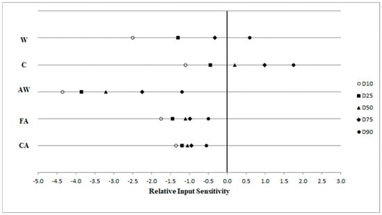 An input with a distribution of Relative Sensitivity Percentages around the baseline has less impact on the output than an input with a distribution of Relative Sensitivity Percentages farther from the baseline. By examining the distance and values of the statistical percentiles, the degree of influence of each variable on the output can be assessed and compared []. As mentioned earlier, it is better to use relative sensitivity values rather than absolute sensitivity values to compare the degree of influence of input variables. Table 4 shows the mean values of the relative sensitivity of compressive strength to the input variables discussed.