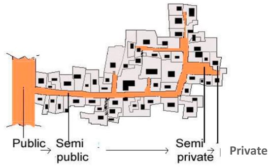 At the micro level, the concept of cul-de-sacs played a crucial role in structuring residential spaces, using dead-end streets to regulate access and define social interactions. These cul-de-sacs transitioned from public spaces into private areas, creating semi-private zones predominantly occupied by extended family members. This arrangement reinforced safety, privacy, and community cohesion, as illustrated in Figure 2 [42].