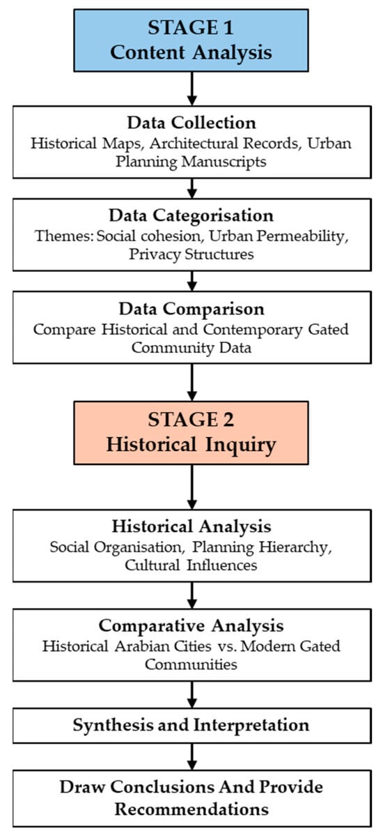 The study follows two stages of analytical methods; stage one will conduct a content analysis of the historical data related to gated neighbourhoods and confine the phenomena or events into defined categories to allow better interpretation [60]. The second stage will involve a historical inquiry into the old Arabian gated neighbourhoods to extract attributes related to social cohesion and integration and assess their relevance to contemporary gated communities. A coding framework was applied to categorise historical records into thematic groups, allowing for comparative analysis with contemporary gated communities [61]. Figure 11 provides a flowchart summarising the methodological process, illustrating how historical and contemporary data were analysed to address the research questions.
