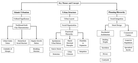 The literature for this study was sourced through a structured search strategy, ensuring comprehensive coverage of academic and historical materials related to gated neighbourhoods. A systematic review of published scholarly articles, books, and historical maps was conducted using databases such as Scopus, Web of Science, and Google Scholar. The selection criteria focused on peer-reviewed sources and authoritative texts that specifically discuss spatial organisation, privacy structures, and social interactions within both historical and modern urban forms [57]. Additionally, archival records and historical manuscripts related to Arabian cities were included to ensure an in-depth comparative analysis [53,58,59], whereas non-peer-reviewed sources were excluded to ensure reliability and academic rigour in historical interpretation. To ensure a rigorous and systematic approach, the study combines content analysis and historical inquiry, supported by a structured analytical framework.