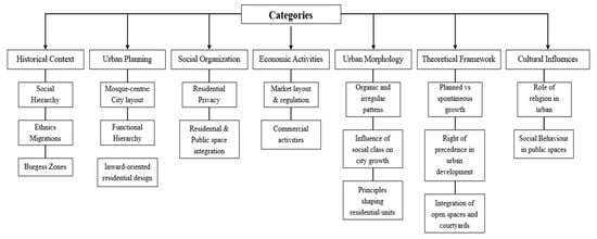 Krippendorff [67] describes content analysis as an objective and systematic way to describe and quantify a phenomenon, analyse documents, and test theoretical challenges that can improve understanding of data. Interpretation of historical records may be influenced by the availability and perspective of documented sources, necessitating a critical approach to avoid retrospective bias. Preliminary analysis revealed recurring themes such as the strategic placement of public spaces to enhance social interactions, the adaptation of urban forms to climatic conditions, and the role of hierarchical street networks in fostering connectivity and community resilience. The primary purpose of content analysis is to provide knowledge and diverse insights by creating replicable interpretations from the data set, aiming to achieve an expansive description of the investigated phenomenon [68]. The process involves selecting units of analysis, such as words or themes, to categorise historical evidence into defined groups. This enables a structured understanding of phenomena like privacy, social interaction, and community engagement, as illustrated in Figure 12, which outlines the analytical framework for content analysis [62,68].