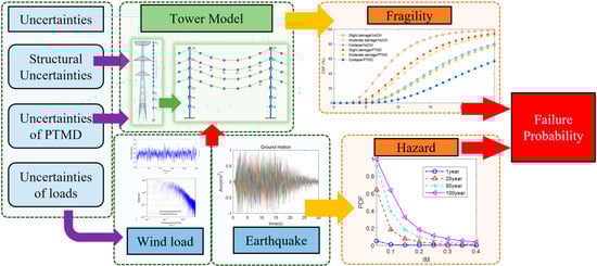 In this study, the probability of failure of a power transmission structure incorporating a PTMD was assessed by integrating its fragility curve with the corresponding seismic and wind hazard functions, thus enabling evaluation of its structural reliability. The fragility analysis was conducted using the incremental dynamic analysis (IDA) method. The hazard function comprehensively considered both seismic activity and wind load. The detailed procedure is outlined below.