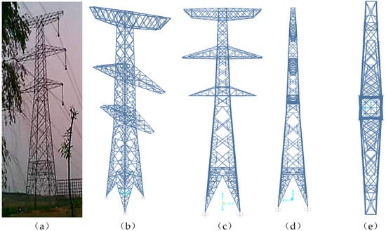 Established FE model of the power transmission tower: (a) onsite photo; (b) 3D view; (c) front view; (d) side view; (e) top view.