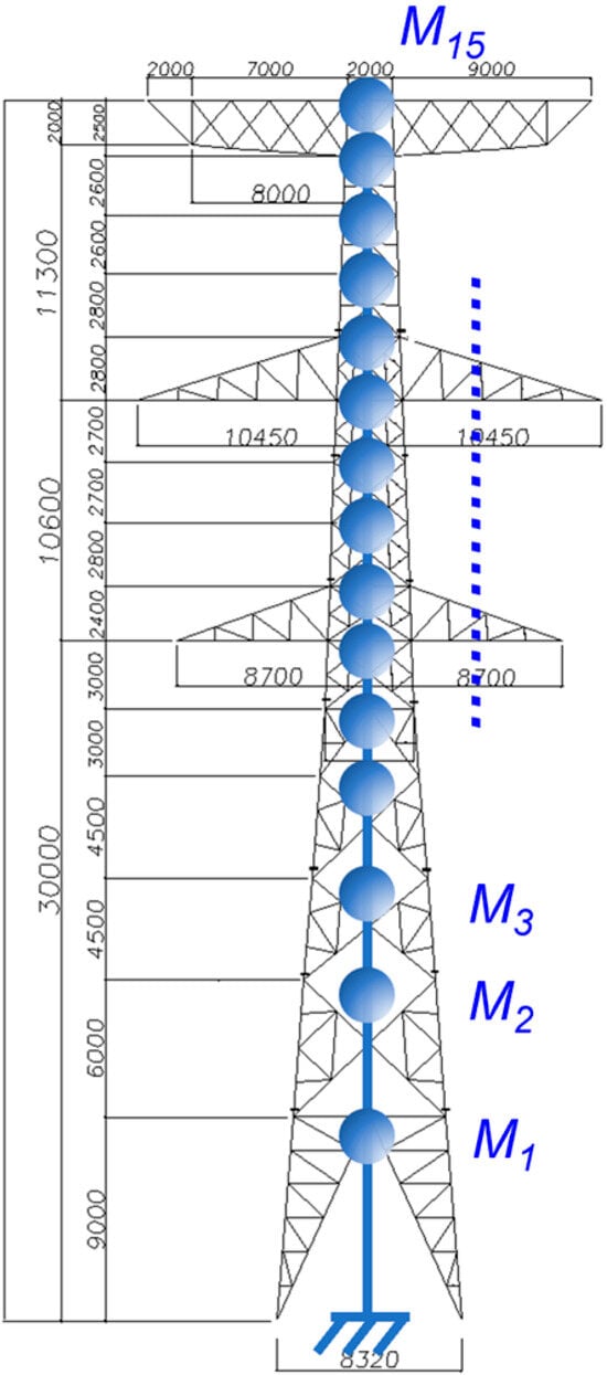 - The power transmission tower was divided into nodes based on its structural characteristics. The positions of the crossarms and crossbraces were considered as a single node layer. In Figure 3, the power transmission tower considered in this study is represented by a lumped mass model of 15 mass components.