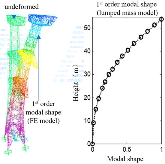 In order to validate the effectiveness of the lumped mass model in predicting the dynamic response of the power transmission tower, the first-order modal shapes computed using the finite element (FE) model and the lumped mass model were compared, as shown in Figure 5. The results revealed a striking similarity between the two modal shapes. Furthermore, the first-order frequencies obtained from the FE model and the lumped mass model were 1.877 Hz and 1.872 Hz, respectively, with a minimal relative error of only 0.26%, demonstrating the suitability of the lumped mass model for numerical analysis purposes.