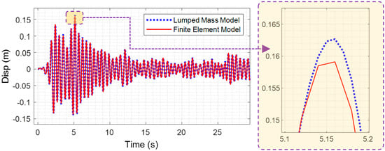 To further validate the accuracy of the lumped mass model for predicting the dynamic response of the transmission tower, the time-history responses of the tower under dynamic loading were computed and the results obtained from the lumped mass model and the finite element model were compared. As shown in Figure 6, the displacement responses from the lumped mass model closely matched those from the finite element model, with minimal deviations observed. The maximum displacement calculated with the lumped mass model and the FE model was 0.1622 m and 0.1595 m, respectively, with a relative difference of only 1.66%. This demonstrates that the lumped mass model provided a high level of computational accuracy, making it a reliable and efficient alternative for dynamic analysis of transmission towers, especially when computational efficiency is a priority.