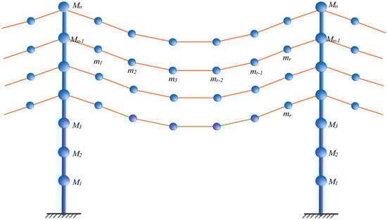 This study employed the classical coupling model, as delineated in the literature [], to compute the dynamic response of the power transmission tower-line system. A schematic of this model is presented in Figure 7. Within this framework, the conductor is approximated as a series of lumped masses interconnected with rigid bars. Previous experimental studies have validated both the accuracy and efficiency of this model.