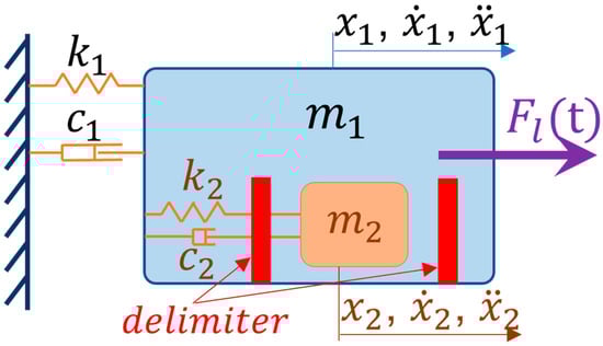 where , and are the mass, damping, and stiffness of the primary structure, respectively. , , and are its acceleration, velocity, and displacement response. Similarly, , and denote the mass, damping, and stiffness of the PTMD, and , , and are the corresponding acceleration, velocity, and displacement. denotes the nonlinear impact force when auxiliary mass impacts the delimiter. and are the loading forces added onto and .