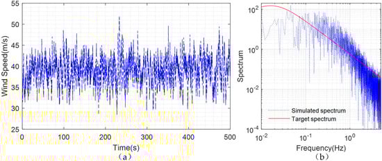 The fluctuating speed can be simulated using the Davenport spectrum and the method proposed by Shinozuka et al. []. More details of this method can be found in []. Figure 9 shows the simulated wind speed at the top of the tower, when the basic wind speed . Comparison of the simulated spectrum and the target spectrum validated the accuracy of this method.