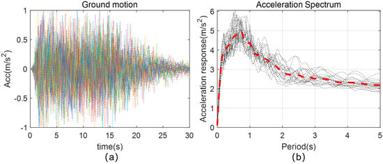 Earthquakes are highly random processes. To consider uncertainty in seismic load, this study simulated 20 ground motions using the following parameters: (1) characteristic period of the site = 0.4 s; (2) structural damping ratio = 5%; (3) duration of the earthquake = 30 s. Figure 10 shows the simulated ground motion record and the response spectrum.