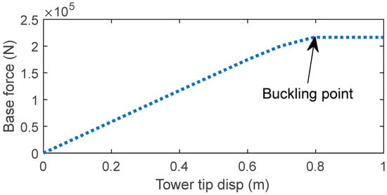 where LS represents engineering demand in a given damage state. For slight damage, it is set to 50% of the buckling displacement; for moderate damage, it is set to 75% of the buckling point; and collapse occurs at 100% of the buckling point. The determination of the buckling point involves conducting static nonlinear pushover analysis on the tower model. During the pushover analysis, the displacement at the top of the tower with the increasing load is recorded. By examining the pushover curve, a distinct buckling point can be identified, marking the transition from elastic deformation to plastic buckling of the tower structure (Figure 11).