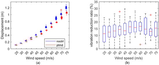 Figure 12 presents an overview of the displacement responses of all structure samples subjected to varying levels of wind. In Figure 12a, a box plot compares the displacements with and without control, showing that the maximum displacement increases as the basic wind speed rises from 25 m/s to 75 m/s. Across all windspeed conditions, the responses observed with the implementation of a PTMD were consistently smaller than those in the non-control case. Figure 12b describes the vibration reduction ratio. The data reveal that the PTMD effectively reduced wind-induced vibrations. Specifically, the reduction in vibration fluctuated between 10% and 30%, with a more pronounced reduction effect at higher wind speeds. This further underscores the significant efficacy of PTMDs in controlling structural vibrations, particularly under high-windspeed conditions.