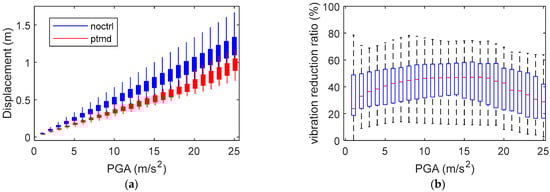 Similarly, Figure 13 showcases the results pertaining to seismic-induced vibrations. Panel (a) features a box plot that compares the displacement of structures with and without control measures. As the peak ground acceleration (PGA) increases from 0.1 m/s2 to 25 m/s2, the maximum displacement also escalates. However, across all PGA conditions, the responses observed with the implementation of the PTMD were consistently lower than those without control. Panel (b) of Figure 13 presents the vibration reduction ratio, demonstrating that the PTMD effectively dampened earthquake-induced vibrations. The reduction in vibration ranged from 20% to 80%, with a more pronounced reduction effect at higher PGAs. Comparing Figure 12b and Figure 13b, it is evident that the reduction ratio relating to seismic activity is greater than for wind load, suggesting that the PTMD is more effective in mitigating the effects of earthquakes.