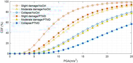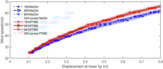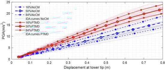 Similar results are evident in both Figure 16 and Figure 17, which present the calculated outcomes of the earthquake-induced vibrations. The dashed red lines represent the IDA curves for the tower with the PTMD, all of which are elevated compared with the blue dashed lines, thereby highlighting the damping capability of the PTMD during seismic events. Compared with Figure 14 (depicting the wind load scenario), the IDA curves under seismic activity exhibit greater dispersion, suggesting that the uncertainty associated with earthquake activity significantly influences the seismic response. Therefore, the selection of earthquake records should be given careful consideration in structural design.