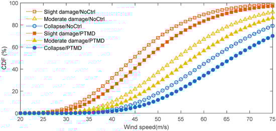 Figure 14 shows the IDA curves for the power transmission tower with and without the PTMD, under wind load. The blue symbols and lines denote the no-control conditions, revealing a positive correlation between increasing wind speed and structural displacement. In contrast, the introduction of PTMD control, represented by red symbols and lines, significantly mitigated this displacement. Figure 15 presents the fragility curves computed using Equation (11), quantifying the probability of different damage states as a function of wind speed. Both figures collectively demonstrate the effectiveness of the PTMD in mitigating wind-induced failure. For instance, at a wind speed of 75 m/s, the power transmission tower without the PTMD had a high 75.0% probability of experiencing collapse (Collapse/NoCtrl curve). However, when the PTMD was installed, the failure probability dropped significantly to 70.1% (Collapse/PTMD curve), indicating a notable reduction in the likelihood of structural failure.