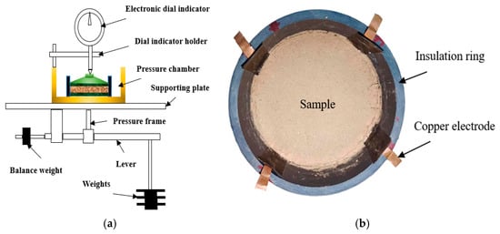 This investigation employed an incremental loading (IL) frame (Figure 1a) to conduct the experimental tests. Vertical loads were applied to soil samples using a consolidation apparatus, which facilitates compression tests and enables the acquisition of soil sample deformations and physical parameters. The minimum vertical load applied was 2 kPa, while the maximum reached 1600 kPa, with an error margin of less than ±2 kPa. To accommodate resistivity measurements, the sample ring was fabricated from rigid plastic, and copper electrode sheets were affixed to the inner wall of the sample ring in a cross-symmetric configuration. The inner diameter of the insulation ring utilized in this study was 80 mm, as illustrated in Figure 1b.