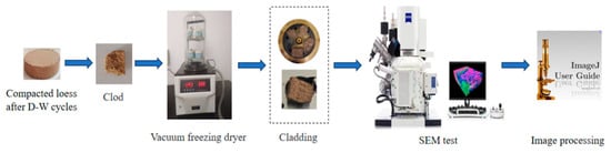 Furthermore, using the Zeiss Gemini SEM 300 (manufactured by Carl Zeiss AG, Oberkochen, Germany), this research endeavor explored the influence of multiple factors on the microstructure characteristics of the compacted loess clods. Prior to SEM analysis, the central portion of the sample, having undergone D-W cycles under a consistent vertical loading of 25 kPa, was excised and shaped into a soil clod measuring 1 cm2 × 0.5 cm. Subsequently, the soil clod was frozen with liquid nitrogen, and its water was extracted by a vacuum freezing drier to preserve structural integrity. Following this, the soil clods, coated with spray-on cladding material, were placed within the observation chamber. Then, SEM imaging of the soil clods commenced following vacuum treatment. The SEM images were subsequently converted into a binary format to facilitate quantitative analysis of two-dimensional porosity under various conditions. Figure 2 illustrates the process of the microscopic tests.