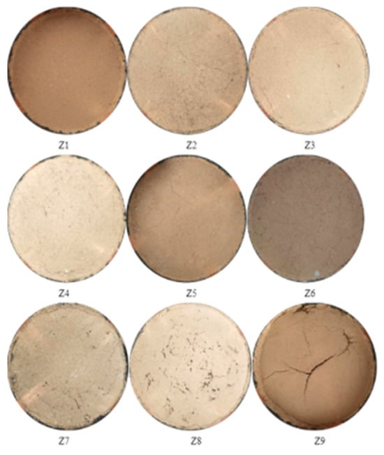Vertical strain is defined as the ratio of vertical deformation to the initial height of the sample. The vertical deformation of the sample during D-W cycles was meticulously monitored using a digital micrometer. To evaluate the extent of crack formation throughout D-W cycles, the crack ratio (CR) was employed to assess the size of sample cracks. The CR was calculated by dividing the crack area by the total surface area of the sample. Figure 3 provides a visualization of crack development in samples Z1–Z9. Regarding resistivity, direct comparisons may lead to inaccuracies []. To mitigate the influence of variations in sample initialization on test outcomes, the resistivity of the initial saturated state of the samples was utilized as a reference point. The measured resistivity was subsequently divided by the reference resistivity to analyze the pattern of resistivity change [].