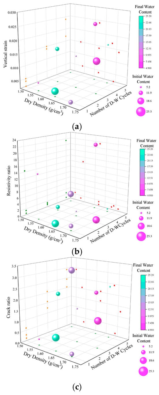Table 3 presents the results of the tests, including vertical strain, resistivity ratio, and crack ratio of the samples. These data are visualized in 3D scatter ribbon and wall graphs, illustrating the variations with respect to dry density, number of D-W cycles, and water content, as depicted in Figure 4.