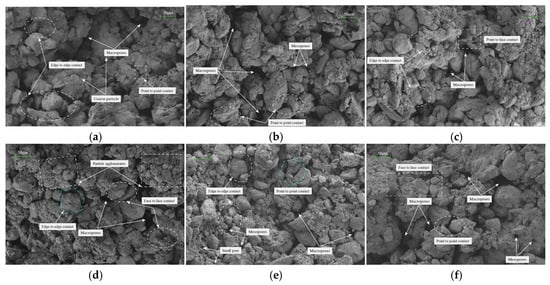 Figure 5 presents the SEM images of soil clods under different conditions. Initially, when comparing the SEM images of soil clods with varying dry densities, it is evident that at a dry density of 1.5 g/cm3, the loess soil skeleton is relatively loose. The soil particles exhibit a chaotic accumulation pattern, with particle contacts primarily consisting of point-to-edge contacts. Additionally, there are obvious overhead pores within the soil clods, characterized by large pore diameters and irregular pore shapes. When the dry density increases to 1.7 g/cm3, the soil gradually becomes denser. The coarse particles are broken, and the quantity of fine particles increases, resulting in the formation of stable aggregates. Concurrently, with soil compaction, the macropores transform into smaller pores. By comparing Figure 5a,b,d,e, it can be inferred that the D-W cycles have a substantial influence on the soil microstructure, and this influence intensifies as the soil dry density increases. During the D-W cycle, some aggregates are separated. This occurs because water can soften the cementing materials, thereby reducing the cementation between particles during the wetting phase, which subsequently disrupts the particle connections []. Furthermore, the nature of particle–particle contacts changes from stable face-to-face contacts to unstable point-to-edge and point-to-point contacts after the D-W cycles. Meanwhile, micropores and small pores are transformed into mesopores and macropores during this process. However, the pore size of some macropores decreases. This is attributed to the splitting of the aggregates during the wetting process, which reduces their size, although some fine particles reaggregate into blocks [].