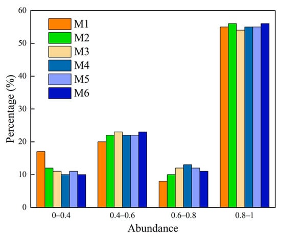 As the C value diminishes, the shape of the soil particles becomes more irregular and tends toward elongation. Conversely, an increase in the C value corresponds to a greater tendency for the soil particles to be rounded. Figure 6 reveals that the abundance of loess particles is primarily distributed within the range of 0.8–1, indicating that the overall shape of the particles is relatively uniform. When comparing the M1 and M2 data, a distinct trend can be observed: the abundance of particles decreases in the 0–0.4 range. However, there is an increase in particle abundance in the 0.4–0.6, 0.6–0.8, and 0.8–1.0 ranges. Then, when comparing the M3 and M4 data, it is found that the particle abundance decreases in the 0–0.4 and 0.4–0.6 ranges, while it increases in the 0.6–0.8 and 0.8–1.0 ranges. Finally, by comparing the M5 and M6 data, it is apparent that the particle abundance decreases in the 0–0.4 and 0.6–0.8 ranges, but increases in the 0.4–0.6 and 0.8–1.0 ranges. Through the above analysis, it is discovered that the particle abundance increases with the increase in dry density, indicating that as the soil undergoes progressive densification, there is a transformation in particle morphology from irregular and elongated to elliptical and rounded shapes. Furthermore, it is observed that after the D-W cycles, there is a decrease in particle abundance in the 0–0.4 and 0.8–1 ranges. The reduction in the 0–0.4 range is the most significant, while there is an increasing trend in the 0.4–0.6 and 0.6–0.8 ranges. This suggests that during the D-W cycles, a transition occurs from nearly round particles to elliptical and irregular elongated particles. Simultaneously, irregular elongated and elliptical particles transform into round particles. In summary, the soil particle abundance slightly increases after the D-W cycles []. Additionally, when comparing M3 with M5 and M4 with M6, it is observed that particle abundance increases with the decrease in final water content. This phenomenon is attributed to the loss of pore water during the drying process, which causes erosion and damage to the soil particles, resulting in the particles exhibiting a more regular shape.