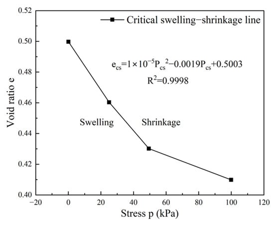 where ecs is the void ratio at critical swelling–shrinkage; pcs is the stress at critical swelling–shrinkage; pre is the initial stress; and acs, bcs, and erc are the parameters. Bringing the parameters into Equation (8), we can obtain the following equation, as shown in Figure 8:
