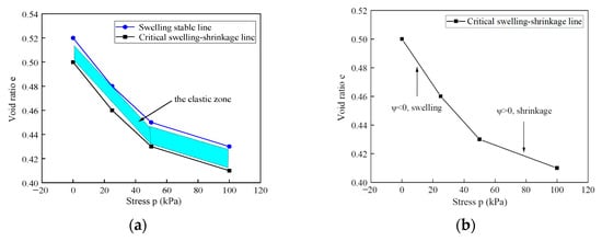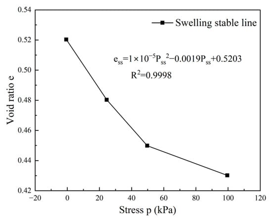 The swelling stable state corresponds to the state where the soil sample is saturated and at critical swelling–shrinkage. The swelling stable line (SSL) is a curve connecting the points in the swelling stable state, as illustrated in Figure 9. The formula for describing the SSL is shown in Equation (10):