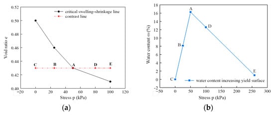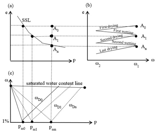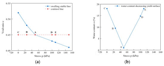 where, ωA is the water content at state A, ωC is the water content at state C, and ωE is the water content at state E; pA is the applied stress at state A, pC is the applied stress at state C, and pE is the applied stress at state E; p is the applied stress; and ωD is the corresponding yield water content.