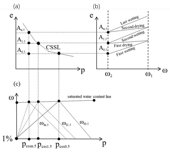 To describe the variations in ωI during D-W cycles, it can be assumed that a soil mass exists, denoted as A0.5, as shown in Figure 14a. Consequently, the initial water content increasing yield surface, ωI0.5, is shown in Figure 14c. After one D-W cycle, the overall deformation observed is swelling deformation (as depicted in Figure 14b), and the current position shifts to A1.5, which is also located within the swelling region. As the critical stress increases, the ψ value of A1.5 decreases, and the water content increasing yield surface shifts to the left, as shown in Figure 14c. Likewise, after several D-W cycles, the current state transits to An.5, where the CSSL is situated. For some samples, the total deformation after D-W cycles is elastic swelling–shrinkage deformation, and the water content increasing yield surface ceases to move.
