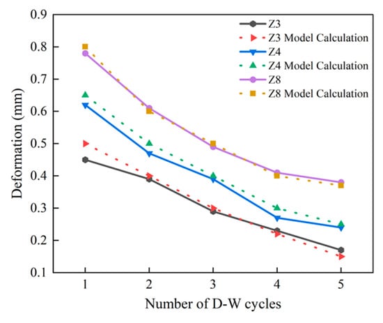 To validate the model, a series of fittings and analyses were carried out on samples Z3, Z4, and Z8 in this study, which had undergone three D-W cycles. A vertical load of 25 kPa was applied to the samples. The model calculation results and the actual results are presented in Figure 15.