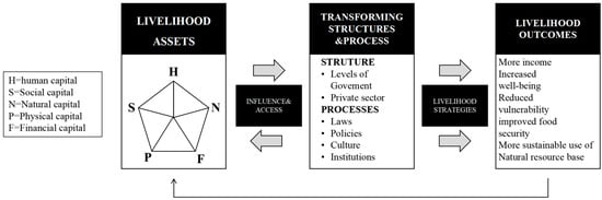 In the original SLF, livelihood assets are typically categorized into the following types: natural capital, comprising natural resources such as land, water, forests, and biodiversity; human capital, which encompasses an individual’s skills, knowledge, health, and labor force; physical capital, including infrastructure and means of production like housing, transportation, and equipment; and financial capital, referring to the availability of funds, savings, and credit (Figure 1). These assets are combined in various activities related to livelihood strategies.
