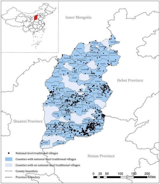 This study takes Shanxi Province, a typical central region of China, as the research scope and selects 619 National Traditional Villages in Shanxi Province as the research objects (Figure 2). The selection of samples from the list of National Traditional Villages ensures the typicality of villages. At the same time, National Traditional Villages have more funds and policy support, with development advantages and research significance. At the same time, as one of the provinces with distinct natural features and cultural characteristics in central China, Shanxi Province has the second largest number of national-level traditional villages after Zhejiang and Guizhou. Therefore, it is of great research value and urgency to explore the sustainable development path of traditional villages in Shanxi. In addition, Shanxi Province has a strong representation and reference value, which can provide a reference for traditional village policy management in other areas.