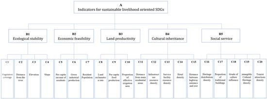 This study constructed a sustainable livelihood evaluation model of traditional villages for SDGs, integrating five key dimensions: ecological stability, economic feasibility, land productivity, cultural inheritance, and social service capacity. The determination of these five dimensions comes from the literature review. In determining the specific sub-indicators, we referenced the specific targets and indicators of the SDGs and incorporated research from other academic colleagues [,,,,]. In addition, we also considered the availability of relevant data to ensure the practicality and applicability of the evaluation model. Finally, 20 evaluation sub-indicators were determined (Figure 3).