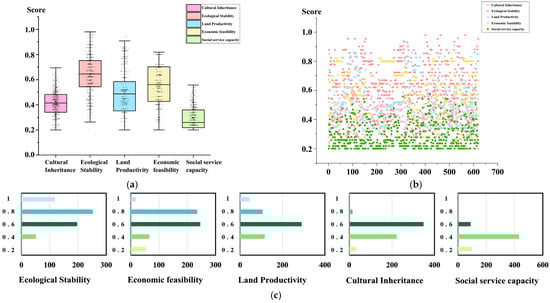 (a) Box plot of village scores on five livelihood assets; (b) scatter plot of village scores on five livelihood assets; (c) score level and number of villages for each asset. Note: The analysis reveals that the social assets in most traditional villages remain sub-optimal.