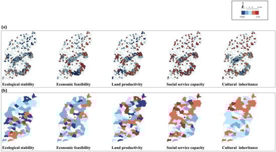 Figure 5a,b shows the characteristics of the spatial distribution of the different livelihood assets at the village and county scales, respectively. From the overall results, the spatial distribution of the low-scoring band was tilted from the northwest region toward the two southern regions, the southeast and southwest. Meanwhile, the score results of single indicators were spatially heterogeneous. High-scoring regions with better ecological resources were mainly concentrated in the belt basin in the center, the Changzhi Basin in the southeast region, and the hilly areas on the western edge. The regions with high economic scores were distributed in multiple clusters around the urban areas of various economic centers from north to south in Shanxi Province, such as Datong in the north, Taigu, Qixian, and Pingyao in the central region, and Changzhi in the south. The areas with high scores in land productivity indicators were spatially dispersed, surrounding the basin in the province’s center in a U-shaped pattern. High-scoring cultural areas were patchy and concentrated in the southeastern region, where many traditional village clusters are gathered. The high scores were mainly focused around Jincheng, Shangdang, and Lucheng, in the basins of Jincheng and Shangdang, which rely on the Qin River and surround the Taihang and Taiyue mountains. Regarding the social service indicator scores, most other regions had low scores, except for the Datong, Taiyuan, Jincheng, and Yuncheng regions, which were point regions with an excellent social service base.