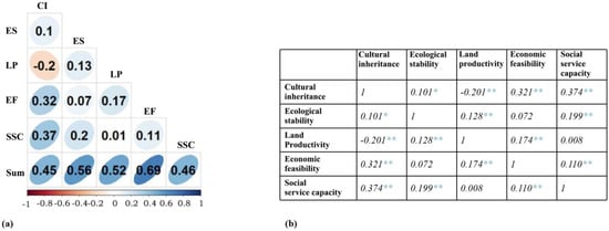 (a) Pearson’s correlation results; (b) SPSS-validated Pearson correlation results. Note: * p < 0.05 indicates a significant correlation; ** p < 0.01 indicates a highly significant correlation. The outcomes of the correlation analysis underscored the significance and utility of cultural capital within the livelihood assets of traditional villages.