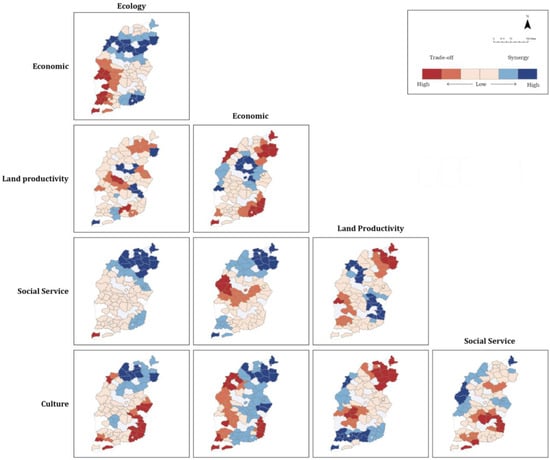 where is the spatial location of point ; p is the number of independent variables; is the dependent variable; is the independent variable; is the random error; denotes the intercept at point ; and denotes the regression coefficient. Like the Pearson correlation analysis, positive regression coefficients indicate spatial synergies, while negative regression coefficients indicate spatial trade-offs. The GWR model was executed at the county scale using the GWR model package in the R4.0 software.