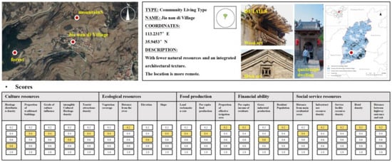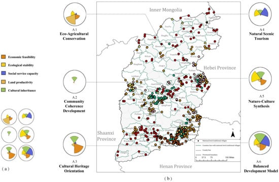 Eighty (12.9%) villages were categorized as Nature–Culture Synthesis (A5). These villages have rich natural economic resources and cultural heritage resources, such as Xi wan Village in the Luliang Mountainous Region in the western part of Shanxi Province, where natural resources such as mountains, forests, and ores are superior, with a high proportion of forest and grassland. In contrast, the village residential texture is well-preserved and distinctive so that, while developing eco-tourism based on the landscape and idyllic scenery, the mountainous eco-landscape sightseeing and tourism routes can be appropriately designed to include the six surrounding traditional villages of the same type (Gengshang et al.) in one of the sightseeing countryside clusters.