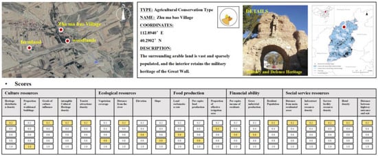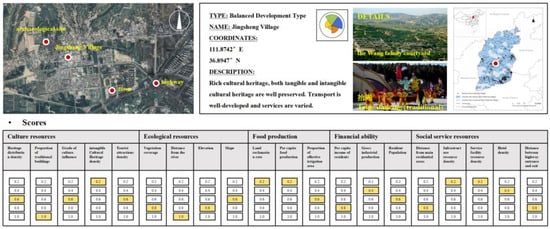 Furthermore. 105 (16.9%) villages were categorized as a Balanced Development Model (A6), which showed good development advantages in all five dimensions, with cultural and social service capabilities being the most prominent, making them suitable for establishing rural tourism clusters. Most of these villages are close to the central urban area, with high urban–rural integration, well-developed facilities, and mature tourism products with high development potential. Jing Sheng Village (Figure 12), for example, is located in the northeastern part of Lingshi County, Jinzhong City, Shanxi Province, and is one of the best-preserved Ming and Qing dynasty rural villages in China. In addition, it has an intangible cultural heritage—a traditional dance called ‘Tai Ge’. However, regarding the level of social services alone, the configuration of infrastructure and service facilities is still insufficient. In the future, it will be possible to cooperate with the neighboring villages, including Zhangbi, Liang, Beiguang, and Duanjia villages, to create a tourist circle, which will lead to the development of the area in a coherent manner and the synergistic development of the wider region. At the same time, the separation of residence and tourism is the key point of the strategy to prevent the destruction of the original villages by overloading tourists. In addition, a monitoring system should be promptly established to assess the impact of tourism development on cultural heritage regularly and to adjust protection and development measures according to the assessment results.