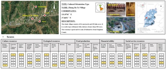 In total, 118 (19.1%) villages were classified as Cultural Heritage Orientation (A3). These villages showed development advantages in the cultural and economic dimensions and are suitable for humanistic-themed tourism development. Taking Zhangjiata as an example (Figure 11), Zhangjiata Village is located in Fangshan County, Luliang Mountainous Region, Shanxi Province, and the whole village is built on a mountainous terrain, forming a unique mountainous settlement. Inside the village is a castle-type complex with over 300 years of history, consisting of 36 courtyards and 252 holes of kiln caves. It was rated as a National Traditional Village in 2016. It is also economically strong due to the cultivation of coal mining. In the future, we should integrate cultural heritage protection into constructing tourism service facilities. This can include developing the unused kiln cave complexes in the village into lodging houses and activity centers for villagers and tourists to promote the appropriate reuse of historical buildings and pay attention to the value and participation of the villagers in conserving their living environment. We aim to promote this community as the leading participant in the protection of cultural heritage to increase publicity and enhance the cultural influence of the villages.