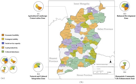 As widely recognized, county-level governance plays a pivotal role in China’s rural revitalization []. By establishing a regional development framework and contiguous-area protection policies, we enable differentiated yet coordinated growth while reducing homogeneous resource competition among villages []. Our approach integrates county-scale zoning with village-specific drivers to implement tiered policies Consequently, we propose a “multi-livelihood zoning” planning strategy as a comprehensive approach to the rural revitalization of Shanxi Province (Figure 13).