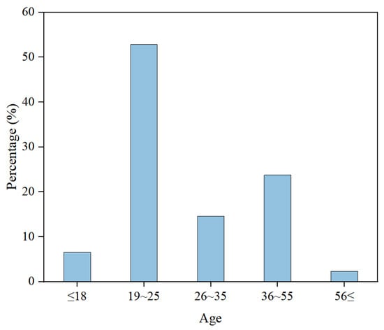The population of the survey was selected from rural residents who were born and have been living in the subtropical region for a long time, and the interviewees were randomly selected with a basic balance between men and women. The respondents were mainly young people (as shown in Figure 3), with most respondents being students aged 19–35, reflecting college students returning to their hometowns during summer vacation. Of the respondents aged 36–55, most worked as farmers in the countryside and worked outside to earn money.
