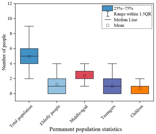 Figure 4 shows that the resident population of residential buildings in Guangdong is family-oriented, consisting mainly of 4 to 6 persons. Among them, there are mostly 2 or 3 young adults, and 0 to 2 elderly people and teenagers, with only 1 or no children. It can be seen that the family population structure in the Guangdong area is complex and diverse, ranging from small families with three or two persons to large families with as many as nine persons.