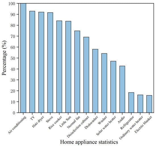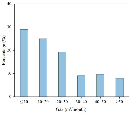 From Figure 13, it can be seen that the number of people whose monthly gas usage is 10–15 m3 accounted for about 25% of the surveyed households, the number of people who use 20–30 m3 accounted for about 19%, and the number of households whose gas usage is more than 30 m3 is fewer than 30%. Close to 30% of the households are using less than 10 m3 of gas, probably because in rural areas it is possible to use firewood to boil water for bathing or to use more electricity for cooking.