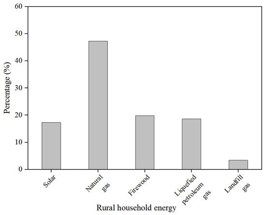 Household energy consumption in rural areas is mainly used for lighting equipment, household electrical appliances, and cooking equipment (as shown in Figure 5), of which lighting equipment and household electrical appliances mainly consume electricity, and cooking equipment consumes different types of energy due to the diversity of types. Common energy sources include electricity, natural gas, liquefied petroleum gas, firewood, biogas, and so on. Due to the unbalanced socio-economic development of rural areas in the province and different living habits in different places, there are some regional differences in the level and structure of energy consumption. In general, the survey shows (as shown in Figure 6) that the energy consumption of rural households is mainly natural gas, except for electricity.