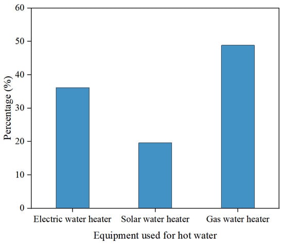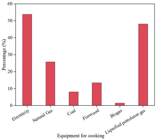 Cooking and hot water supply maintain people’s daily life and food and are the main energy consumption in rural areas in general. As shown in Figure 7, hot water is mainly obtained by heating with electricity and natural gas, and solar heating accounts for a minority of residents, because solar energy is greatly affected by the weather and cannot be used when it rains or is cloudy. As shown in Figure 8, the main sources of energy used for cooking are electricity and liquefied petroleum gas, and the electrical appliances are electric rice cookers and induction cookers, which are more popular because they are less difficult to obtain and cleaner. Due to the living environment, some residents use firewood for cooking. Less than 10% use coal and biogas.