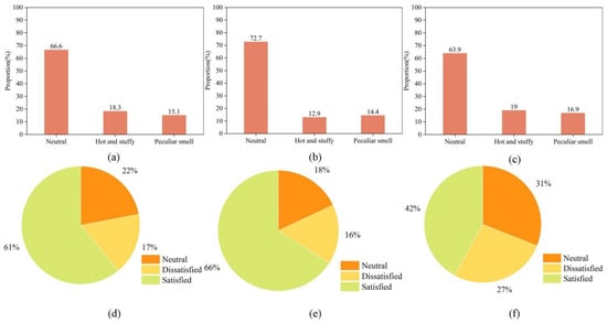 Air quality assessment: (a) bedroom, (b) living room, (c) kitchen. Air satisfaction evaluation: (d) bedroom, (e) living room, (f) kitchen.