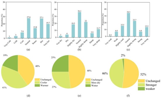 (a) Thermal sensation statistics, (b) wet sensation statistics, (c) airflow sensation statistics, (d) thermal expectation statistics, (e) wet expectation statistics, (f) airflow expectation statistics.